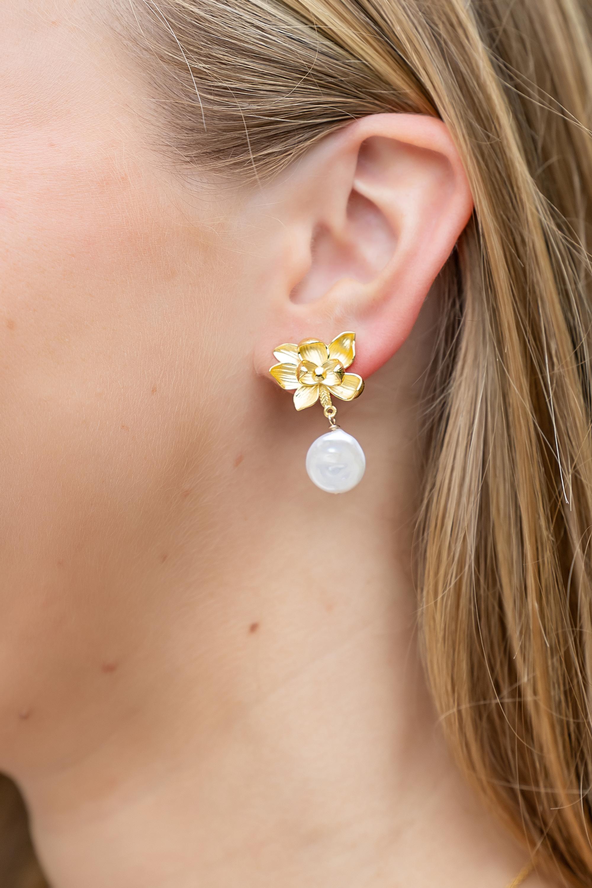 Embrace sophistication with our fresh water pearl and gold-plated magnolia post earrings, designed to capture the graceful beauty of blooming magnolia flowers. Their intricate vine detailing and lustrous finish make them a timeless accessory that adds a touch of elegance to any outfit.